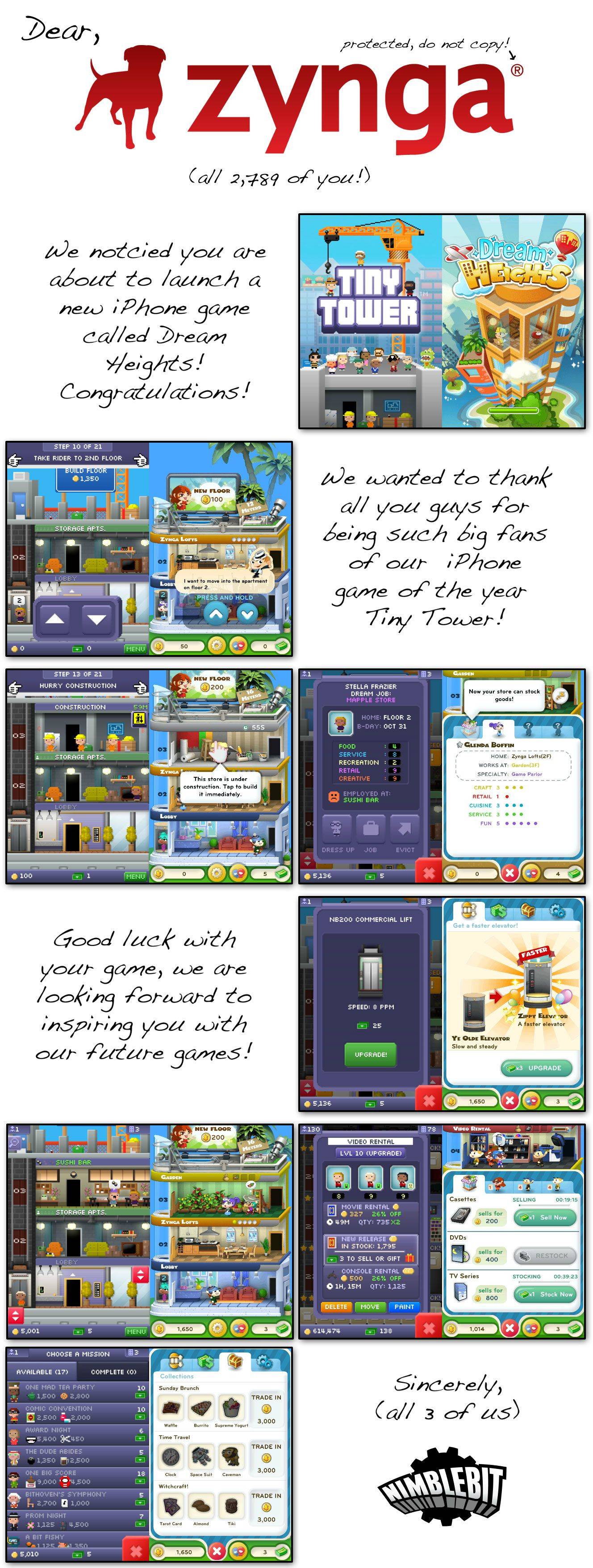 Even most of the allegations of cloning won’t go anywhere. A lot of people say that Candy Crush Saga is just a clone of Bejeweled and Papa Pear Saga of Peggle. They could be and since it’s not illegal, they can actually make more. Take Zynga for example, for every game it releases, there’s an accusation of cloning. The most notable of these accusations being the three-person company Nimblebit’s Tiny Tower clone, Dream Heights.
